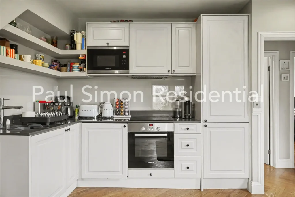 Base mounted units and wall mounted cupboards, integrated appliances, fridge/freezer, microwave, washer dryer, spotlights, electric hob and oven with extractor hood, sink with mixer tap, herringbone parquet flooring, double-glazed sash windows to side aspect and Velux window to rear aspect.Bedroom One