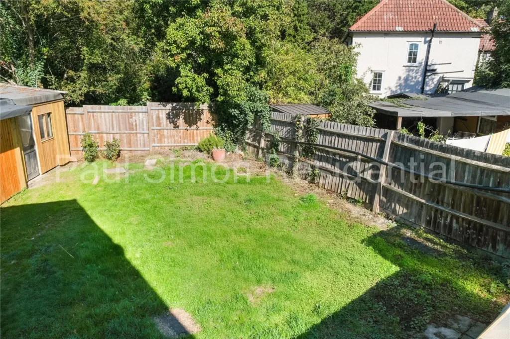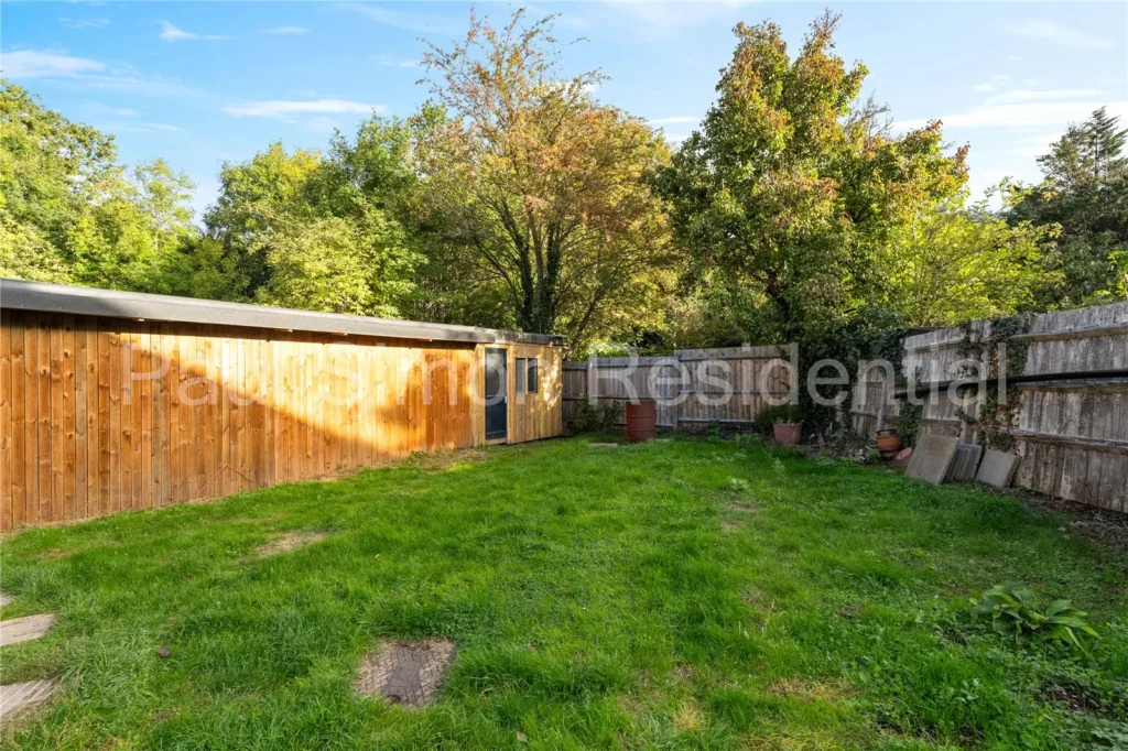 Mature lawn, shrub borders, garden shed, and newly build workshop and side gate access.
