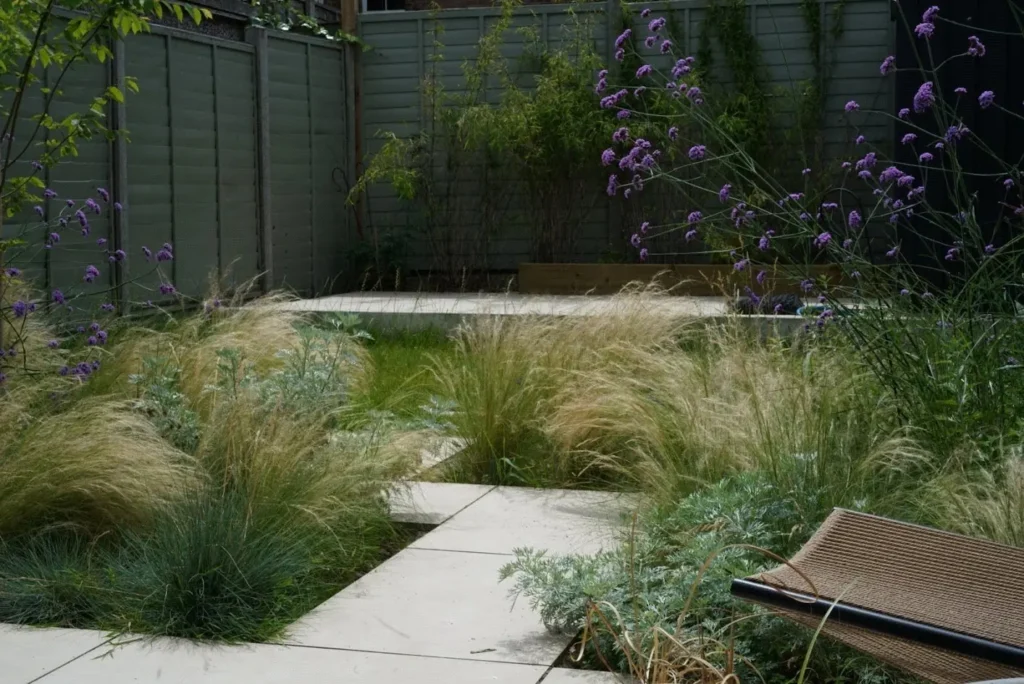 The landscaped garden continues the interior’s style with contemporary planting, seating areas, and premium lighting, forming a seamless extension of the living space.