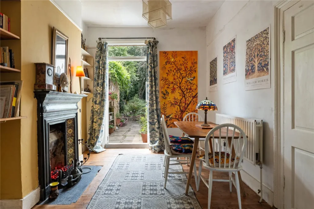 Exposed wooden flooring and , double-glazed window with fireplace.Dining Room