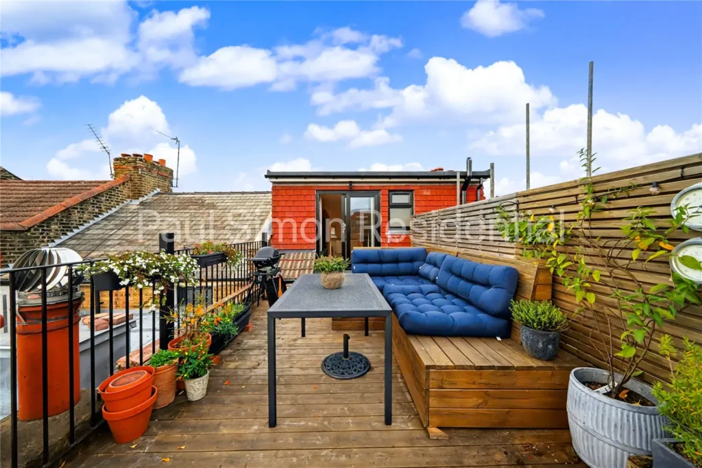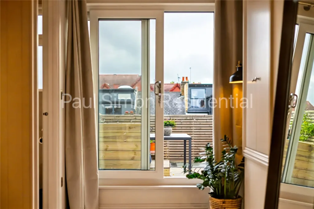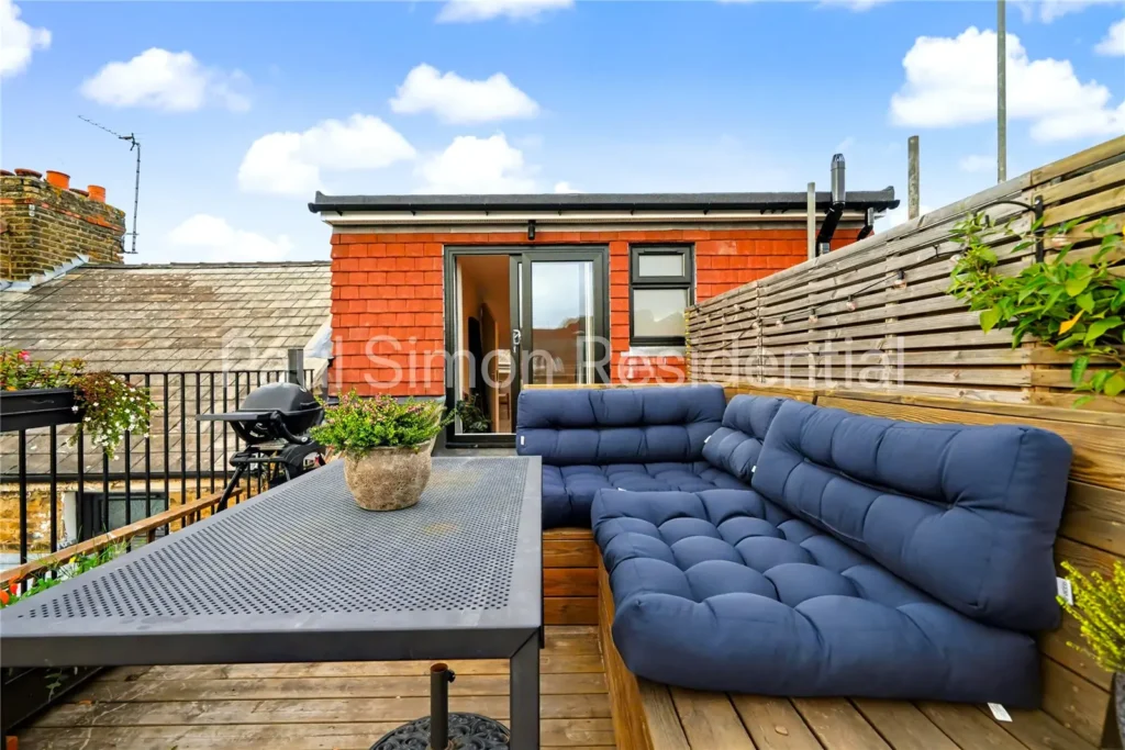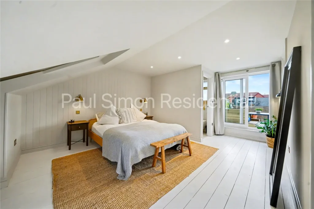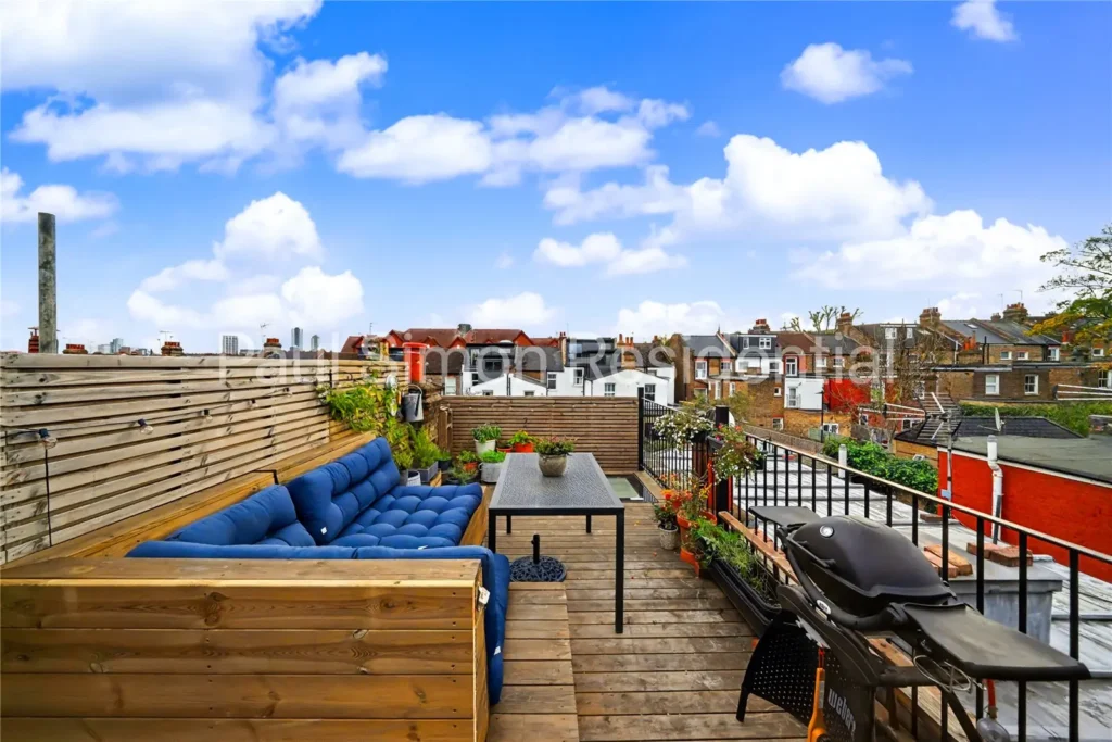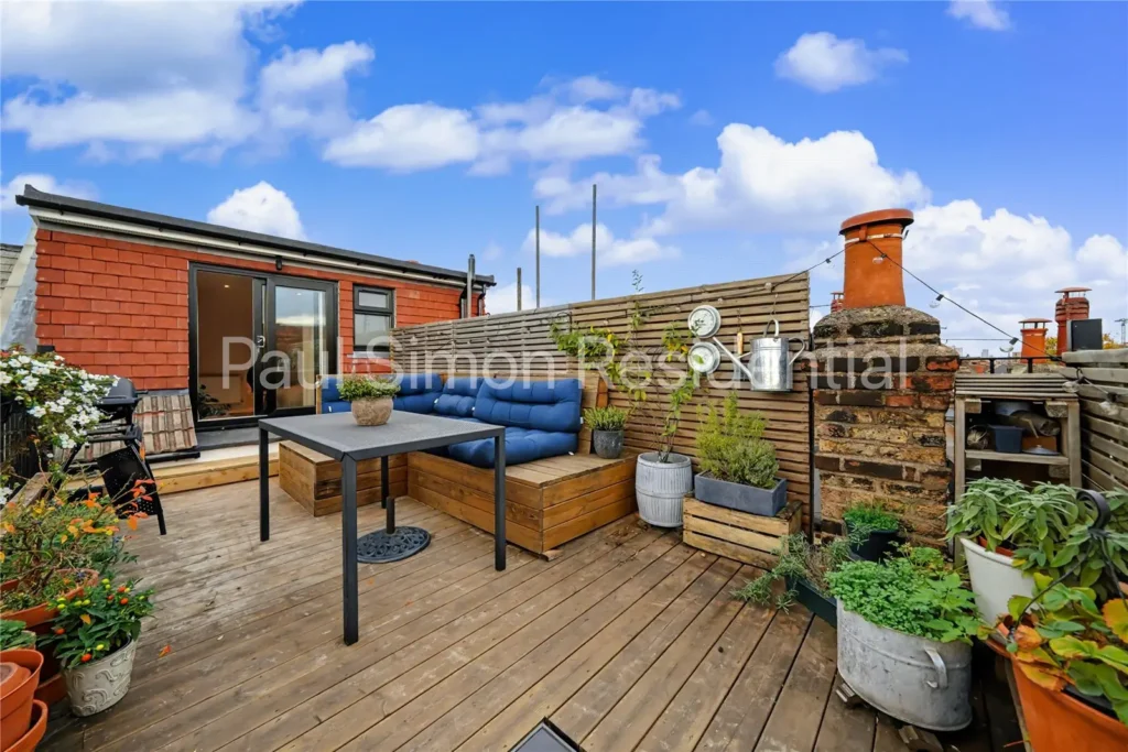 Spanning over 1,072 sq. ft (99 sq. m), the property offers generous proportions and a superb layout ideal for modern living. Accommodation includes two spacious double bedrooms, with the principal suite featuring an interior designed and newly fitted en-suite shower room and direct access to the private roof terrace – perfect for a morning coffee while enjoying panoramic views across London’s skyline.