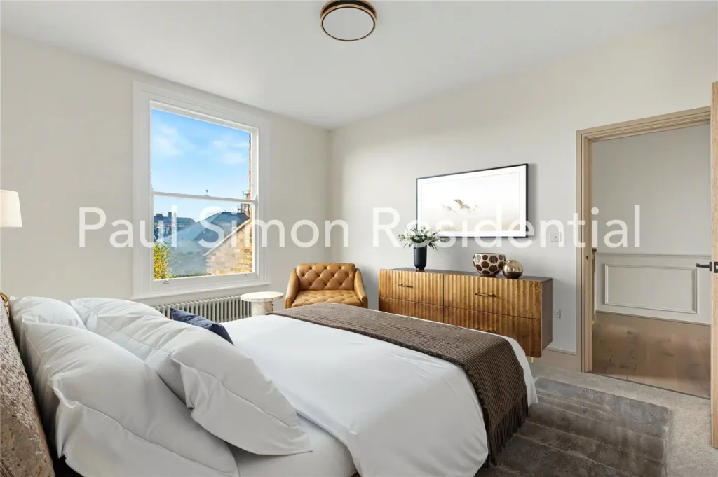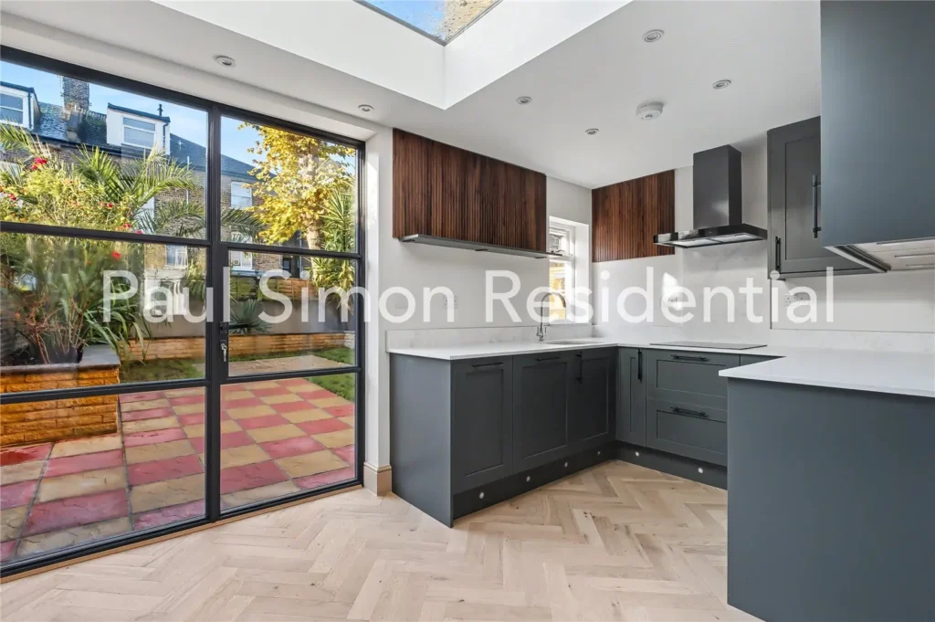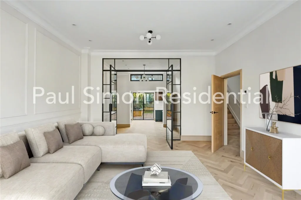 To the rear, the contemporary kitchen has been thoughtfully designed with stylish cabinetry, ample worktop space, and integrated appliances. Crittall-style doors open directly onto a private south-facing garden, providing a quiet outdoor retreat perfect for alfresco dining, children’s play, or unwinding in a leafy environment. This level also includes a guest WC.