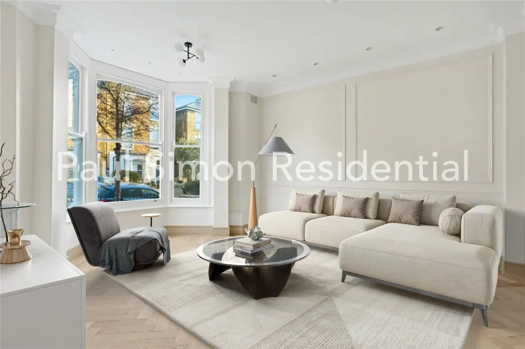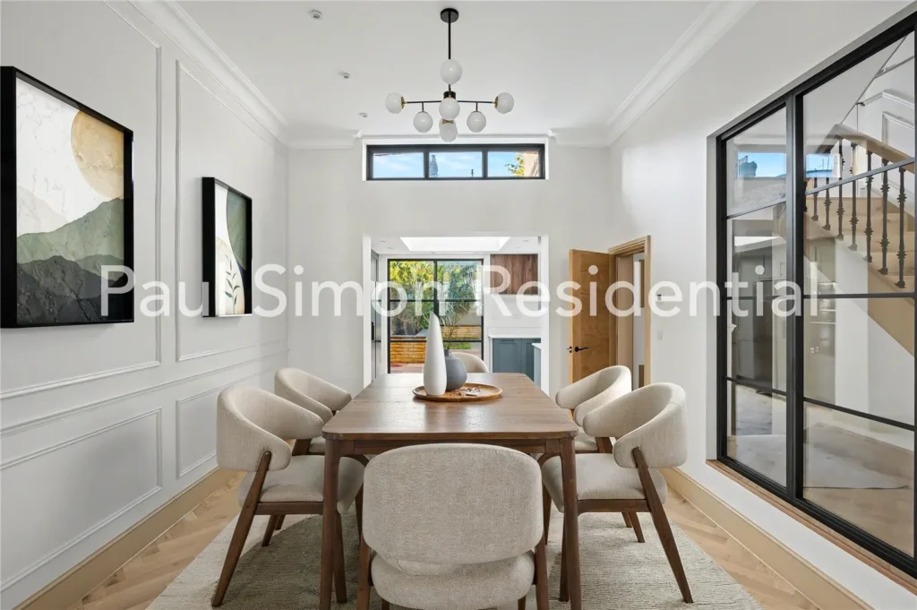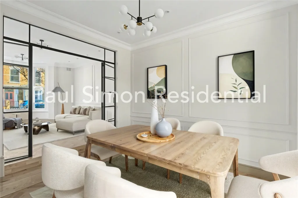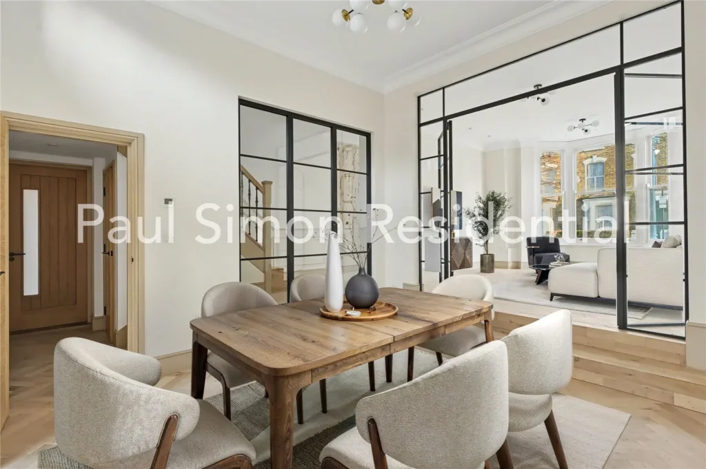 Elegant Crittall-style double doors frame the bright and generous through-lounge, where herringbone flooring and refined wall panelling create a sophisticated feel. The ground-floor reception rooms are connected by high-quality Crittall-style internal doors, while the bay-fronted living area benefits from high ceilings, intricate cornicing, and excellent natural light — an inviting space for both relaxed day-to-day living and entertaining. The spacious dining room flows seamlessly into the well-designed kitchen, offering an ideal arrangement for family meals and dinner gatherings.